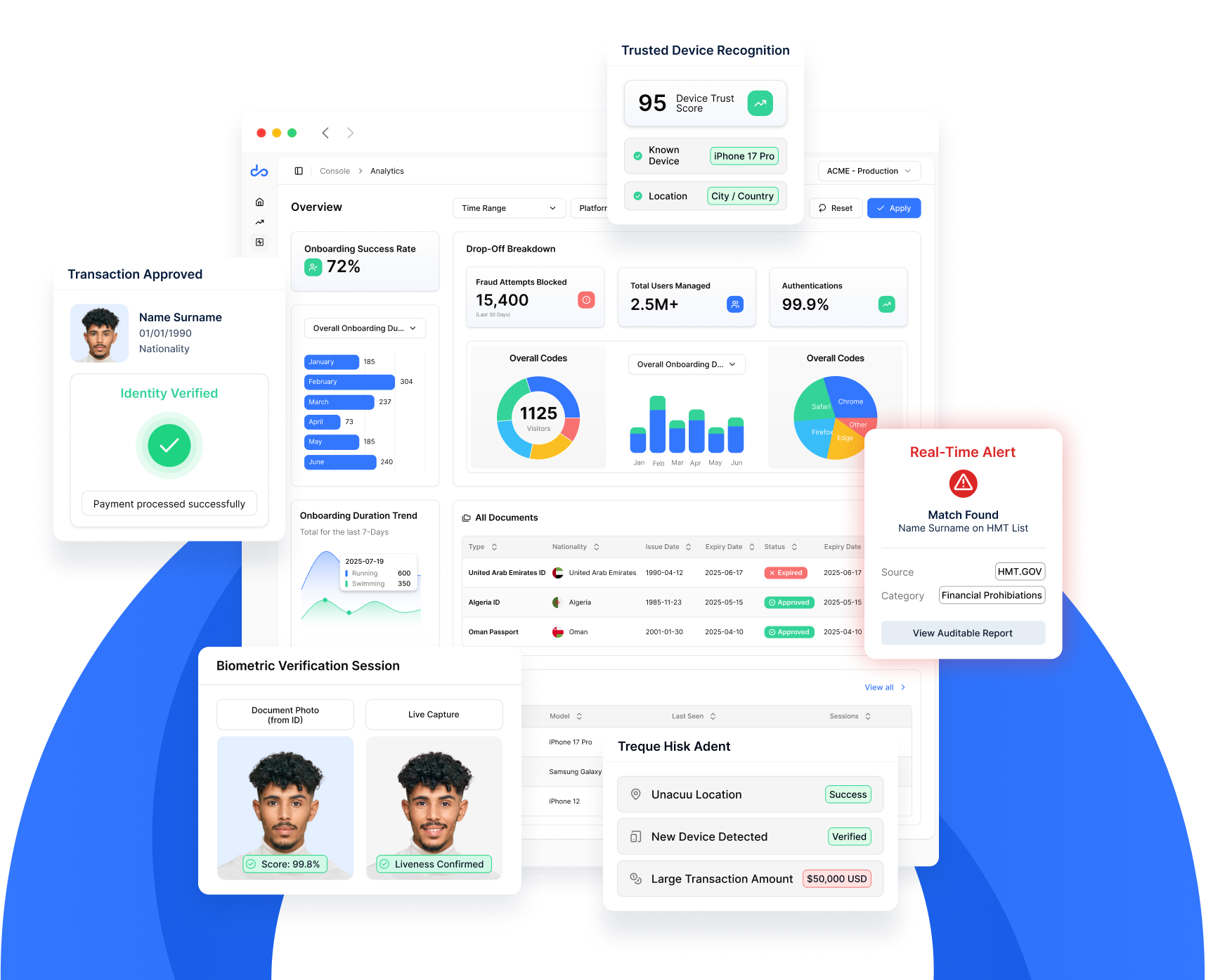 Real-time risk scoring using 30+ configurable device signals, delivering actionable trust scores with customizable thresholds by use case.