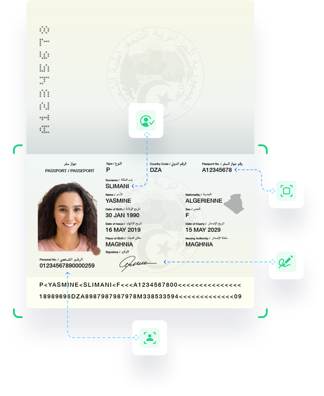 uqudo verifies Algerian passports issued by the Ministry of the Interior, Local Authorities and Territory Planning, extracting and validating all critical personal information.