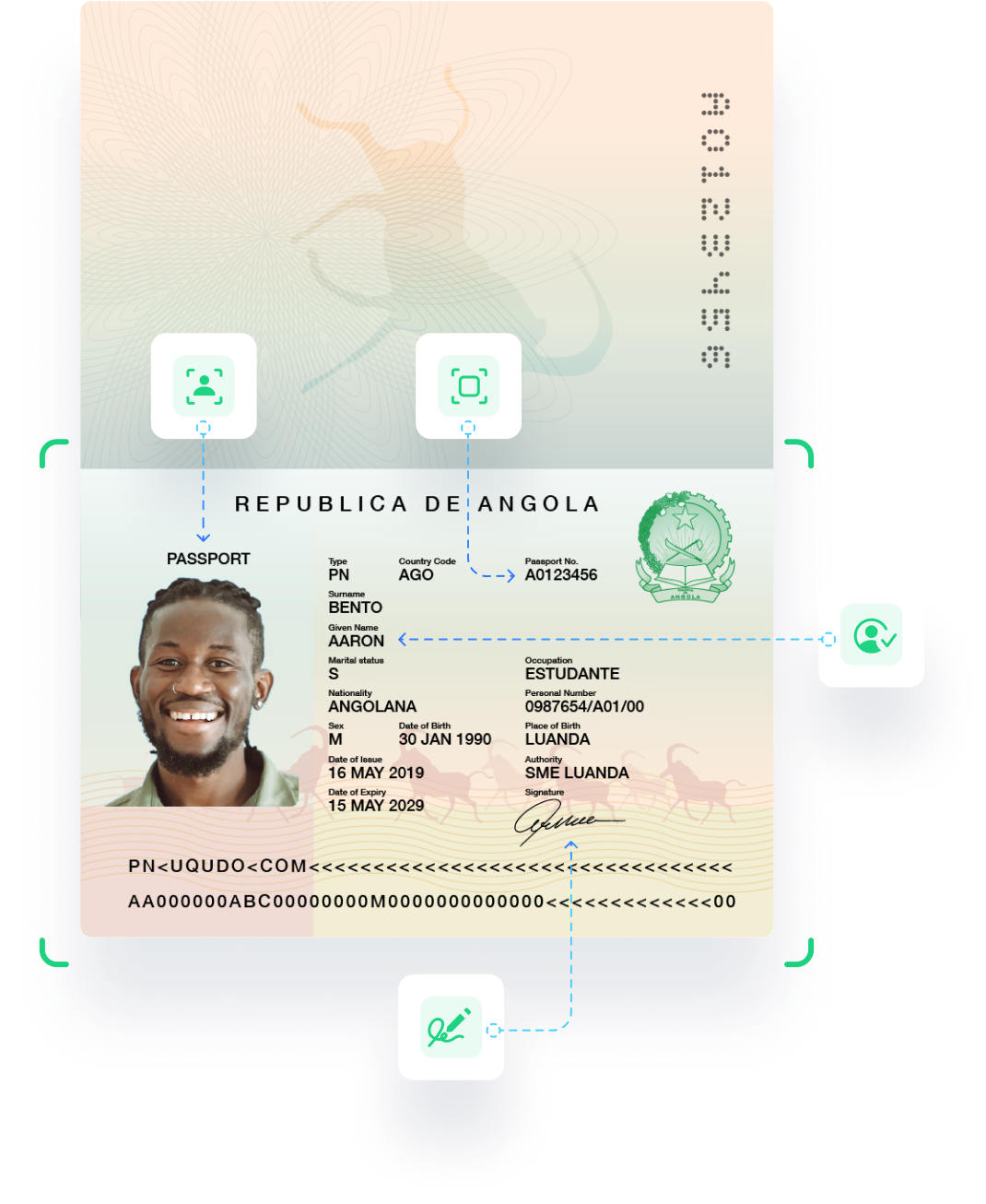 uqudo verifies Angolan passports issued by the Migration and Foreigners Service, extracting and validating all critical personal information.