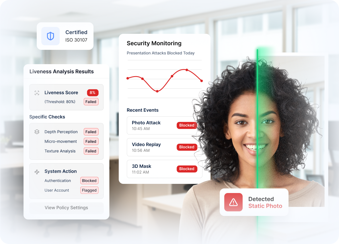 Prevent spoofing attempts with sophisticated liveness detection that ensures the authenticating user is physically present.