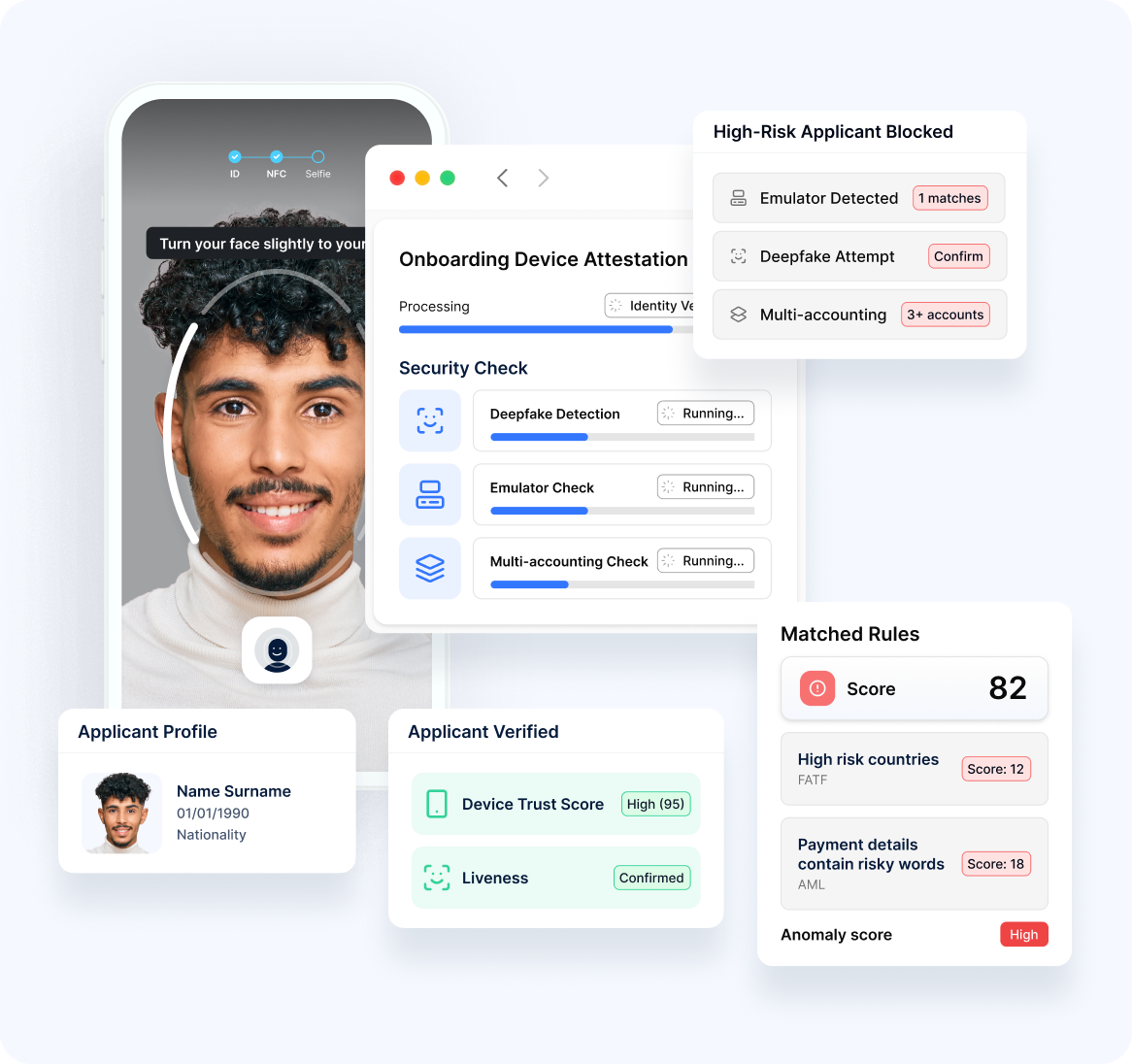 Detect and block deepfakes, hooking attacks, emulators, and device spoofing with 20+ configurable signals