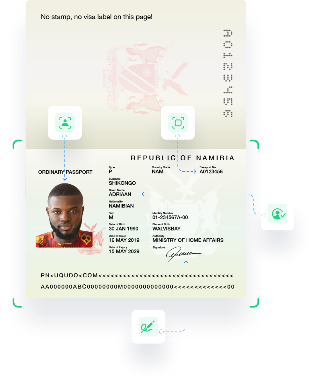 uqudo verifies Namibian passports issued by the Ministry of Home Affairs and Immigration, extracting and validating all critical personal information.
