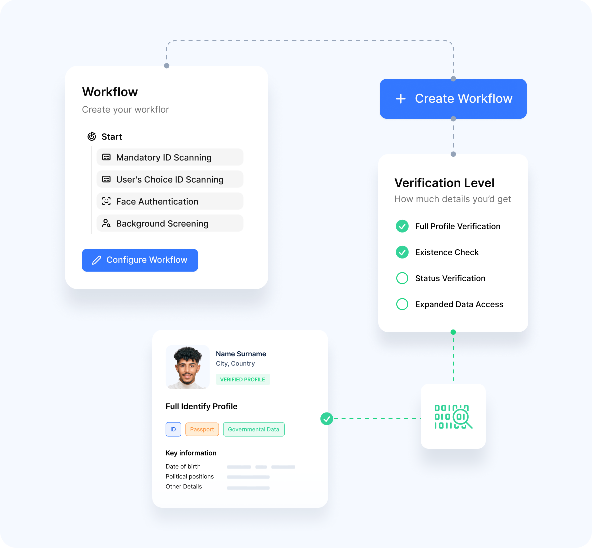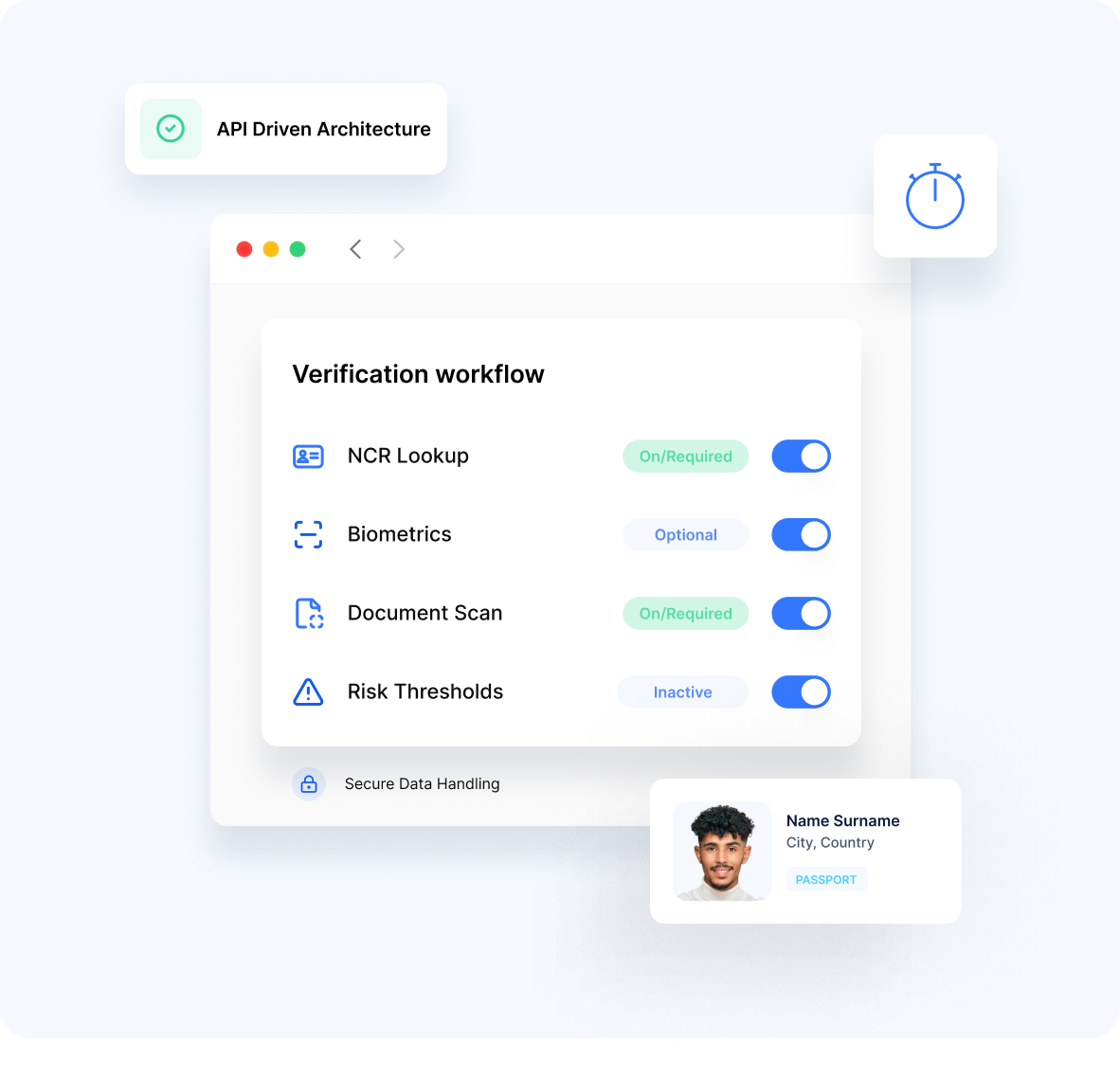 Standalone verification against government databases, combined verification with document scanning and biometrics, or stepped verification based on risk thresholds - Real-Time Results