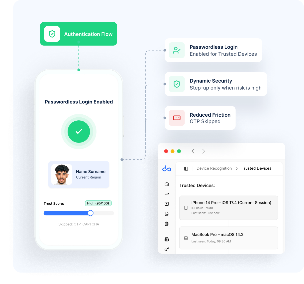 Trusted devices get seamless access: reduce OTPs and challenges while maintaining strong security for genuine users on recognized devices.