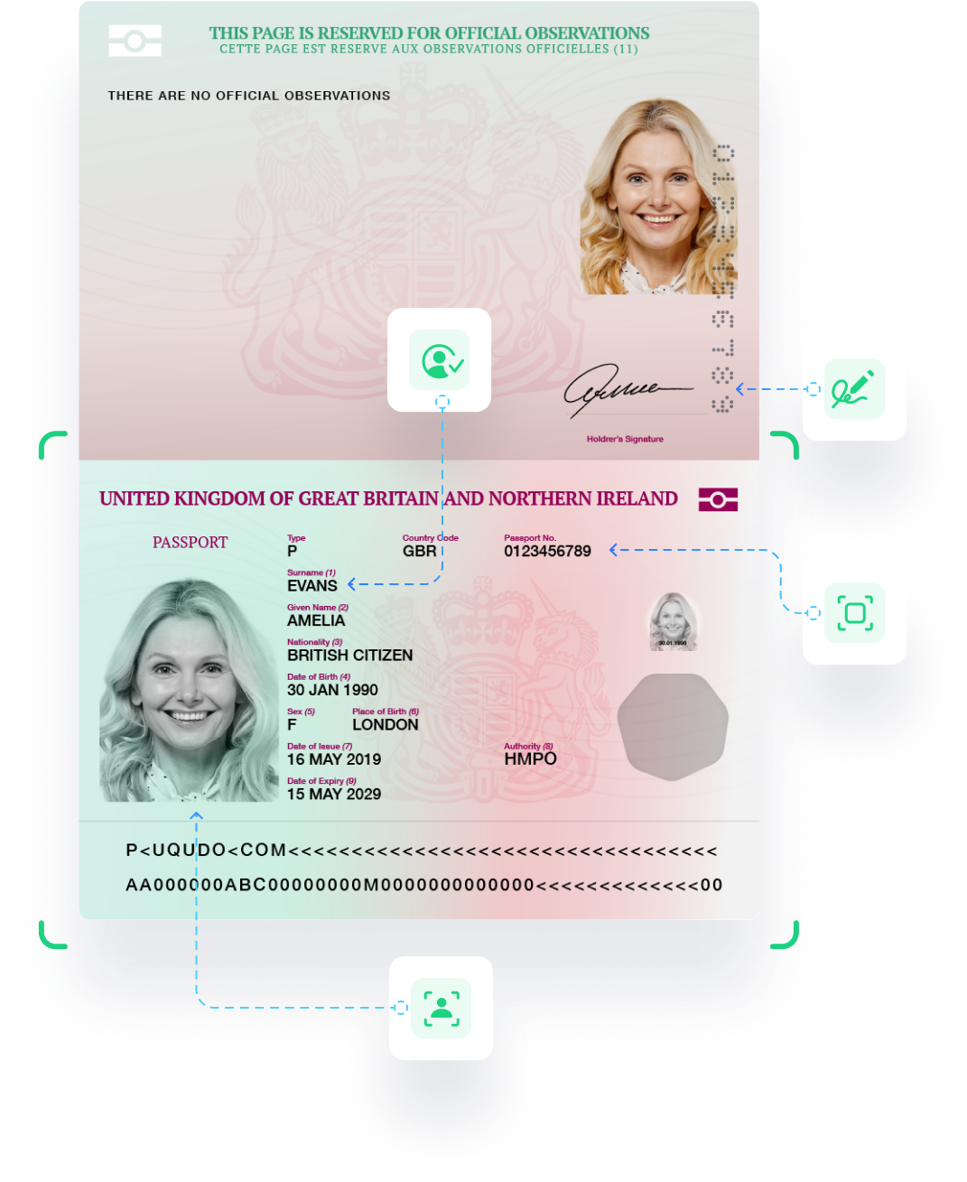 uqudo verifies United Kingdom passports issued by HM Passport Office, extracting and validating all critical personal information through multiple verification layers.