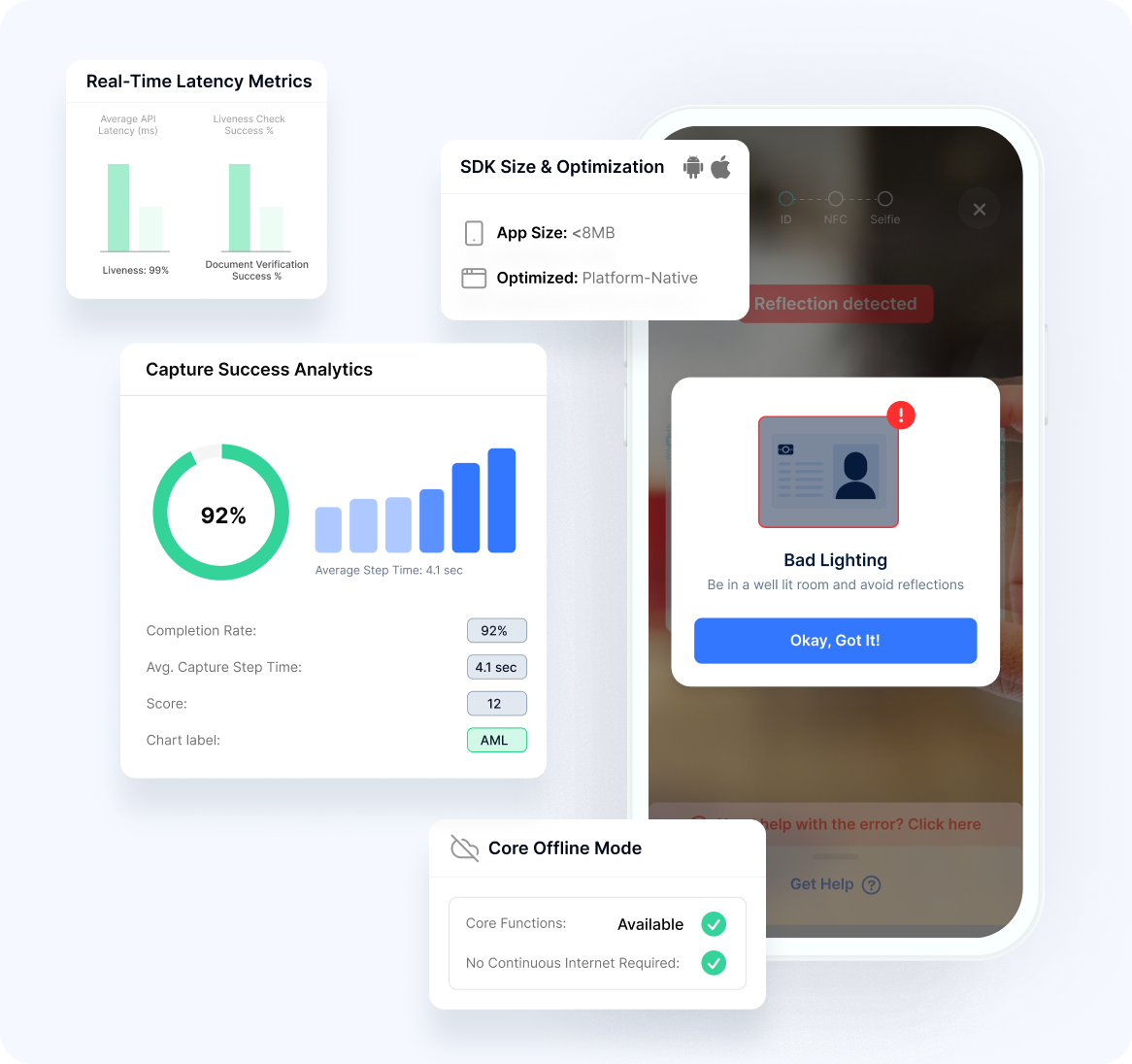 By combining cutting-edge AI with lightweight implementation, we deliver the perfect balance of security, accuracy, and user experience directly within your mobile application.