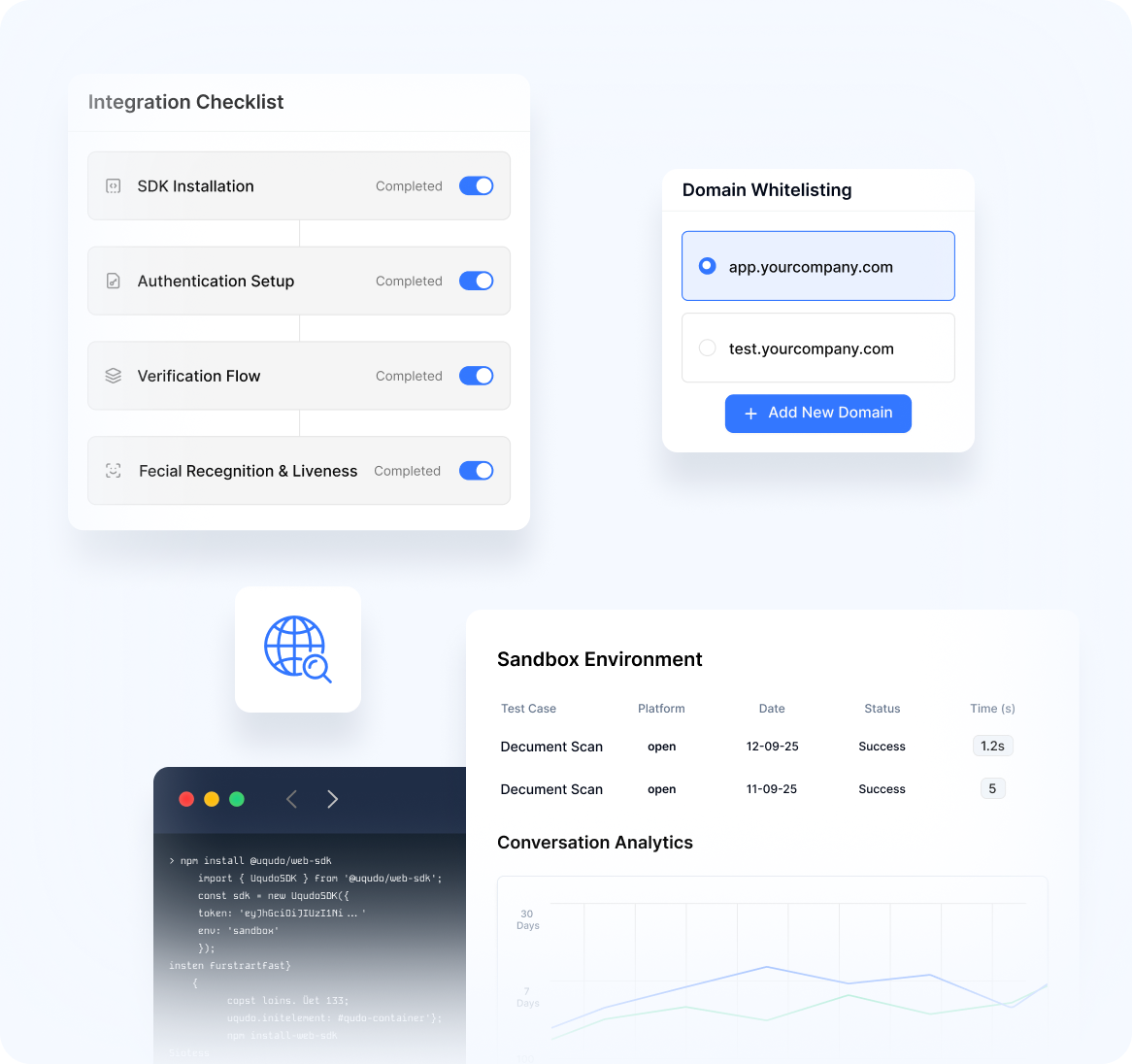 Install via npm package manager or include via Content Delivery Network (CDN), then configure domain whitelisting through the uqudo portal for security.